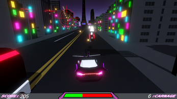 Gameplay description: An endless-runner where you can shoot down enemies and avoid obstacles. You can attack with your equipped projectile weapon as well as spin to knock enemies away with the blade on the front of the car. Each checkpoint has four unique cosmetics to find and unlock. Miss one? No problem: just restart at each checkpoint you've unlocked and give them another go.